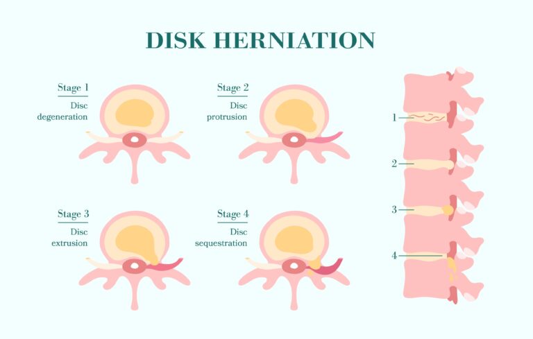 Im Krankheitsprozess spielt die Bandscheibenhernie eine zentrale Rolle. Zu Beginn kann es sich um eine Vorwölbung handeln, und in der schwersten Form um eine Sequestration (wenn ein Teil des Gallertkerns sich ablöst und in den Wirbelkanal gelangt). Jeder dieser Zustände beeinflusst, wie wir den Patienten behandeln, um die Beweglichkeit des Segments zu erhalten.